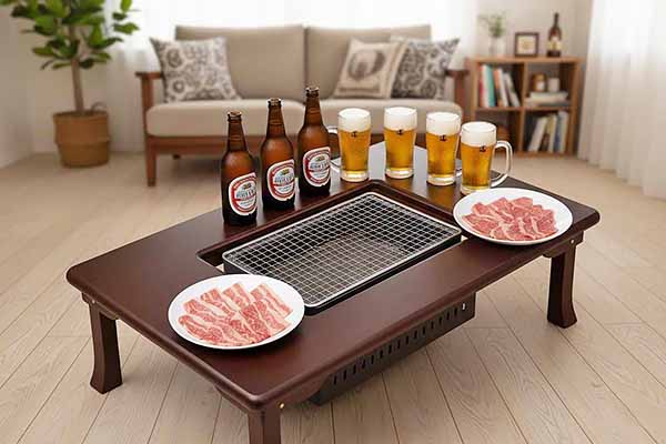 まずは玄一郎氏にお風呂で今日の汗を流していただき、いよいよ夕食の焼肉パーティーです!我が家のダイニングの座卓テーブルは一味違います。なんと、中央をくり抜いて炭火用のコンロを収納できるように私が改造した「特別仕様」。ビールで乾杯し、今日の出来事を妻に報告しつつ、肉を焼き始めました。