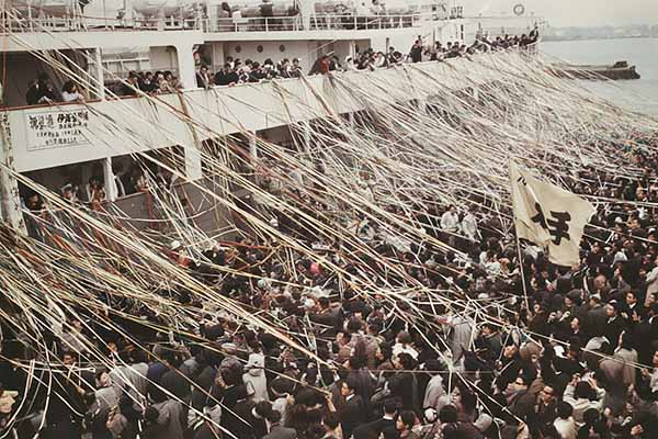 交錯するテープと歓呼の嵐の中、静かに岸を離れる