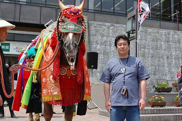 翌日、小木氏を盛岡駅へ送る道すがら、日比谷公会堂と同じ設計者による「盛岡市公会堂」を案内しました。昭和天皇のご成婚記念で建てられた歴史に、彼は興味深そうにカメラを向けていました。盛岡駅に到着すると、6月10日(土)に開催される「チャグチャグ馬コ」のイベントが行われており、賑やかな中での見送りとなりました。