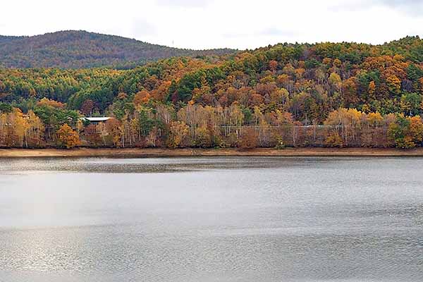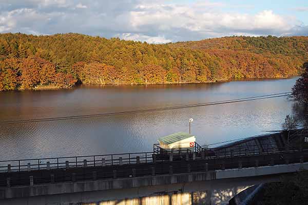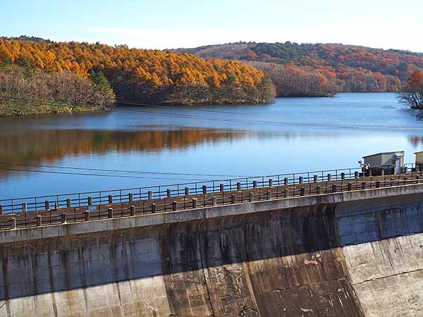 このダム、戦時中の電力確保のために建設された歴史を持っています。堤高は33mと比較的コンパクトですが、その貯水池は意外と広く、紅葉に囲まれた美しい人造湖を作り出しています。