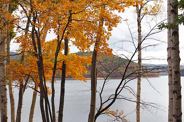 そして、ドライブをさらに延ばすなら岩洞湖へ。湖畔にはシラカバ、ナラ、赤松といった樹々が群生し、それぞれが異なる色に染まることで、まるで錦の織物のような風景を作り出します。青い湖面とのコントラストが見事で、どこを切り取っても写真映えする絶景ばかり。カメラを手に取れば、何枚撮っても飽きないほどの美しさです。