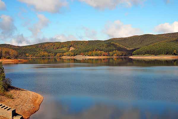 岩洞湖は、自然豊かな美しいスポットです。特に秋は、湖畔を取り囲む山々が鮮やかに色づき、息をのむような絶景が広がります。赤や黄色に染まった木々が、静かな湖面に鏡のように映し出される光景は、まさに自然が織りなす芸術作品。湖を取り巻くブナやカエデの木々が、深紅から黄金色へとグラデーションを作り出し、訪れる人々を魅了します。