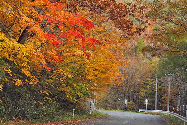 早坂峠と外山ダムへと続く分岐点周辺の亀橋では、秋になるとカエデやシラカバなどが色鮮やかに染まる絶景の紅葉スポットです。ドライブを楽しみながら、高原の澄んだ空気と美しい景色を満喫できます。